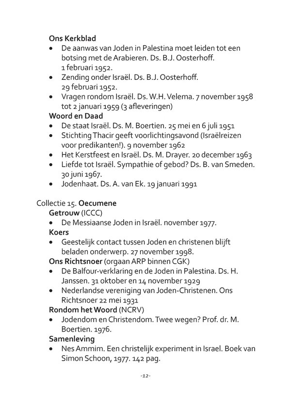 Machiel Vennik (†2023), medewerker van het Documentatiecentrum van de CGK, heeft een overzicht gemaakt van artikelen, preken, boeken en geluidsopnames van 1892-heden met verwijzingen naar Jodendom, Palestina en Israël. De beheerder van het Documentatiecentrum, Jan Noorlandt, noemt dit werk ‘Machiels mooie monnikenwerk’.